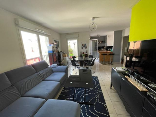 Appartement 3 pièces comprenant une entrée avec placards, une cuisine aménagée et équipée ouverte sur le séjour, deux chambres, salle de bains et WC.